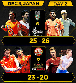 El marcador general, luego de disputadas dos series en la ciudad japonesa de Saitama, muestra las siguientes posiciones: 1º Indian Aces (6 puntos, 56/42 en games); UAE Royals (4 puntos, 49/42); Japan Warrios (3 puntos, 40/50); y OUE Singapore Slammers (1 punto, 44/55).